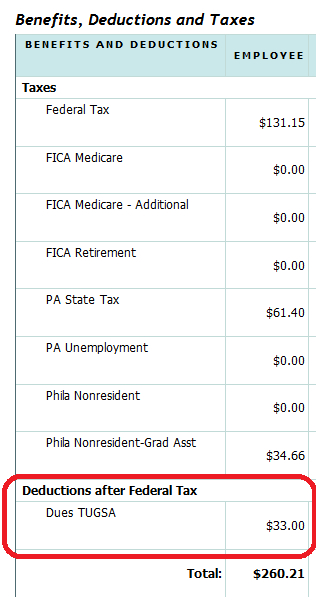 Email us at union@tugsa.org and we’re happy to check for you! You can also verify this yourself through the following steps: If you are a Full Member, your dues are automatically deducted from your monthly paycheck by Temple University. You can check your Pay Stub in TUPortal to see if you are already signed up. If you are a Full Member, you should see “Dues TUGSA” at the bottom of your pay stub under “Benefits, Deductions and Taxes” (see example below). If you signed up in the last month, it is possible that your membership has not yet been processed, so check again in a month and contact us if you still do not see dues being deducted.